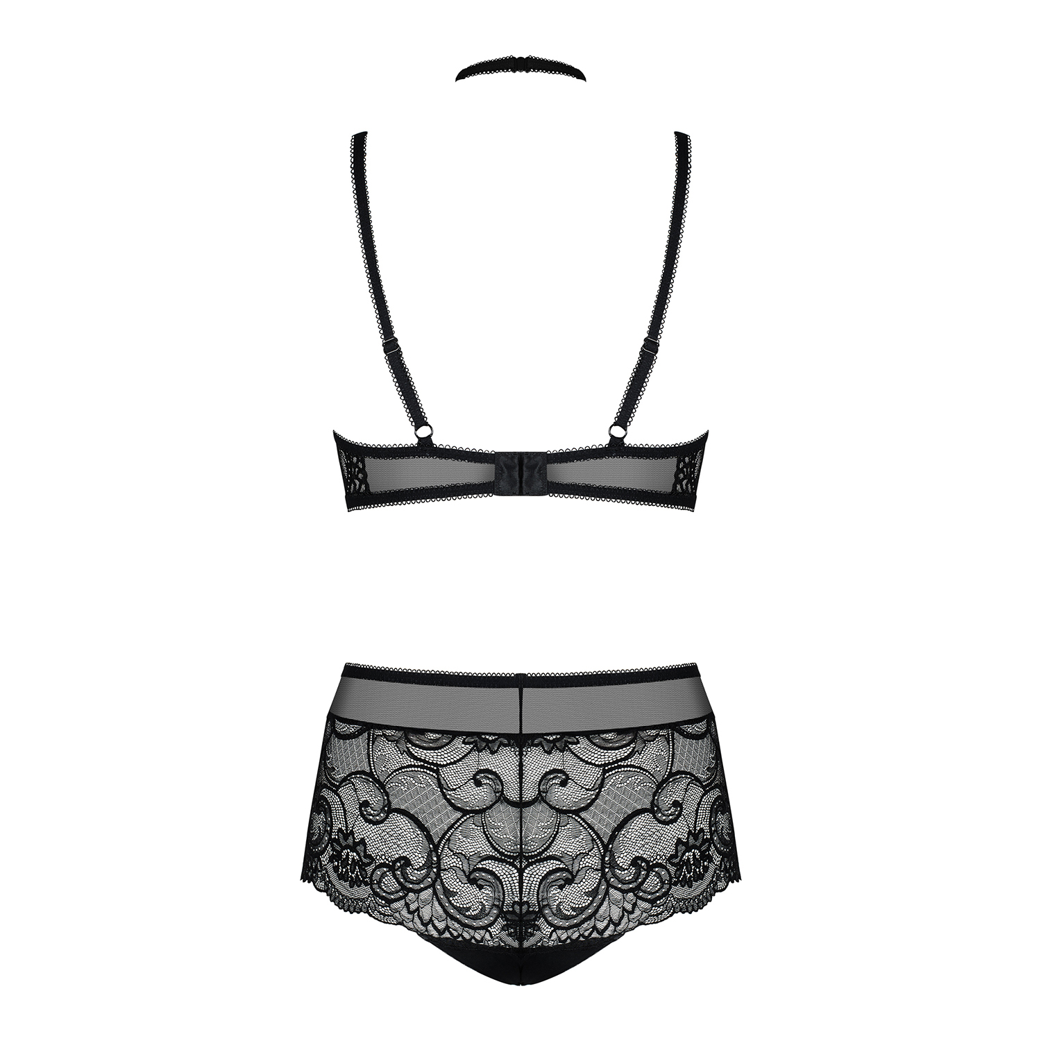 Enamórese del encaje negro y del lujoso diseño del conjunto Elizenes. Gracias al magnífico sujetador que hemos preparado para usted, su amado le susurrará seductoras confesiones durante toda la noche. La gargantilla de encaje le dará un toque chic y el lazado súper sensual entre los senos intensificará sus fantasías. El conjunto está coronado por un encaje translúcido con un dibujo sensual.