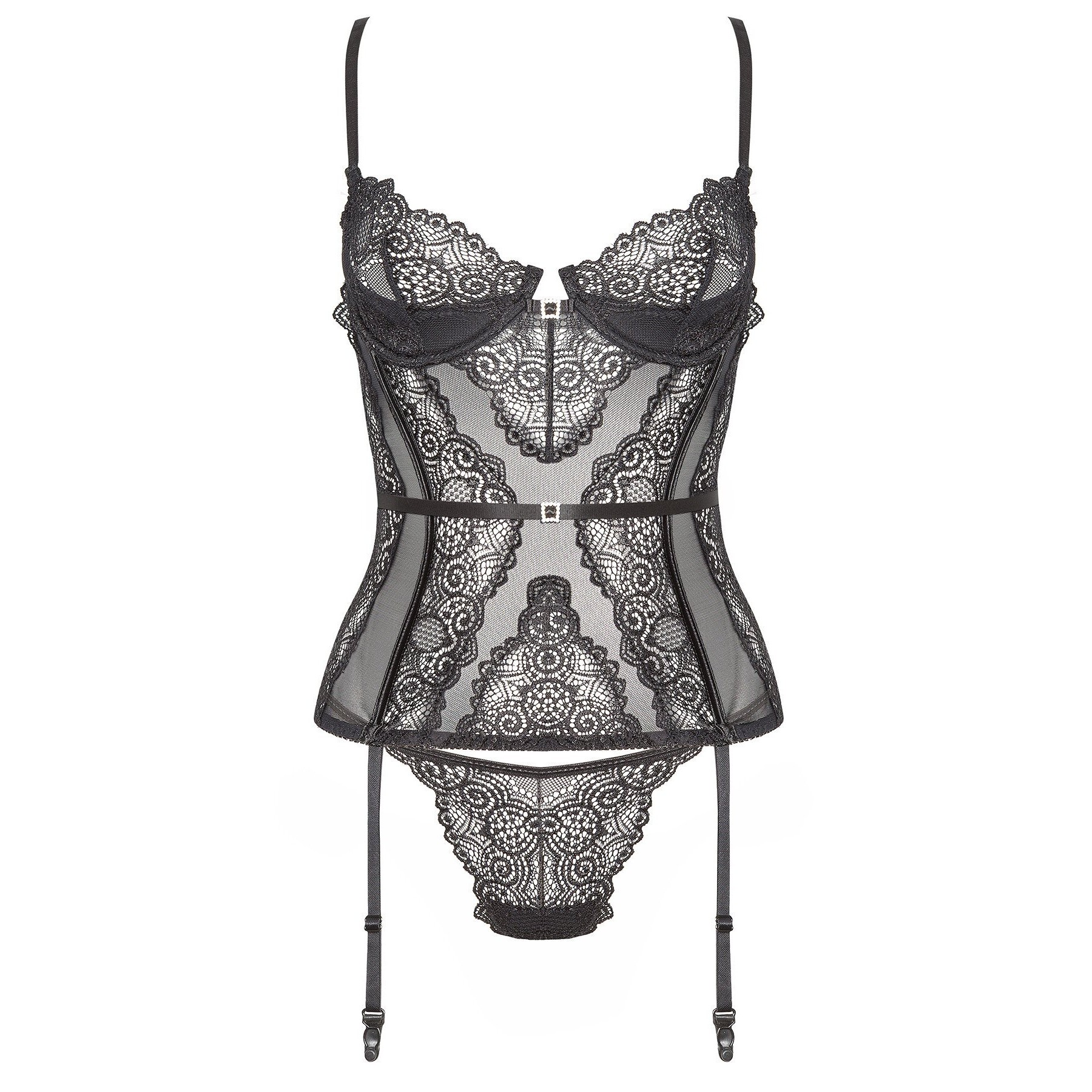 Diseño: El tanga combina perfectamente con el corsé, creando un conjunto armonioso. Las copas acolchadas proporcionan una excelente sujeción y forma al busto. La cremallera trasera permite poner y quitar fácilmente el corsé. El delicado encaje acentúa las curvas femeninas y aporta sensualidad.