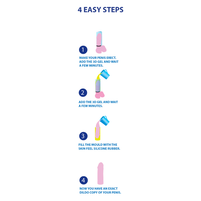 Siga las instrucciones detalladas en el interior del envase. Corte el plastico y coloque la funda en una de las puntas para que sirva de cierre. Mantenga el pene en erección, a continuación coloque el anilloen la base del pene. Mezcle el gel 3D con agua. Coloque el gel sobre el pene envuelto en el envase plastico. Aguarde cerca de 3 minutos y retire el pene. Abra el envase de silicona y la revuelva, coloque en el molde. Pasados unos minutos retire y tiene una replica perfecta de su pene.