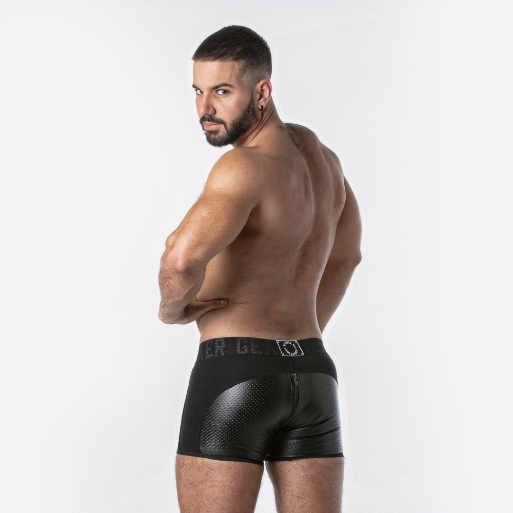 Bóxer de corte cuadrado fabricado en cuero sintético perforado y detalles en contraste.