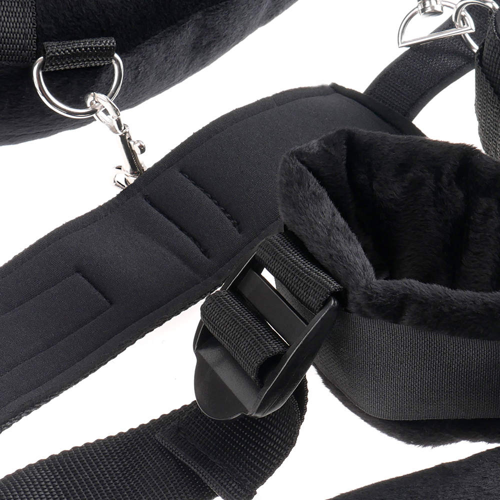 Ajustable, seguro y confortable con esposas para los tobillos y muñecas almohadadas. Llegó el mejor soporte de ayuda al sexo. Ahora con almohada para el cuello hecha en pelo suave. Atrévase a usar este kit para hacer las posiciones con que siempre había soñado, pero nunca consiguió. Tiene ahora a su disposición la mejor penetración. Incluye antifaz.