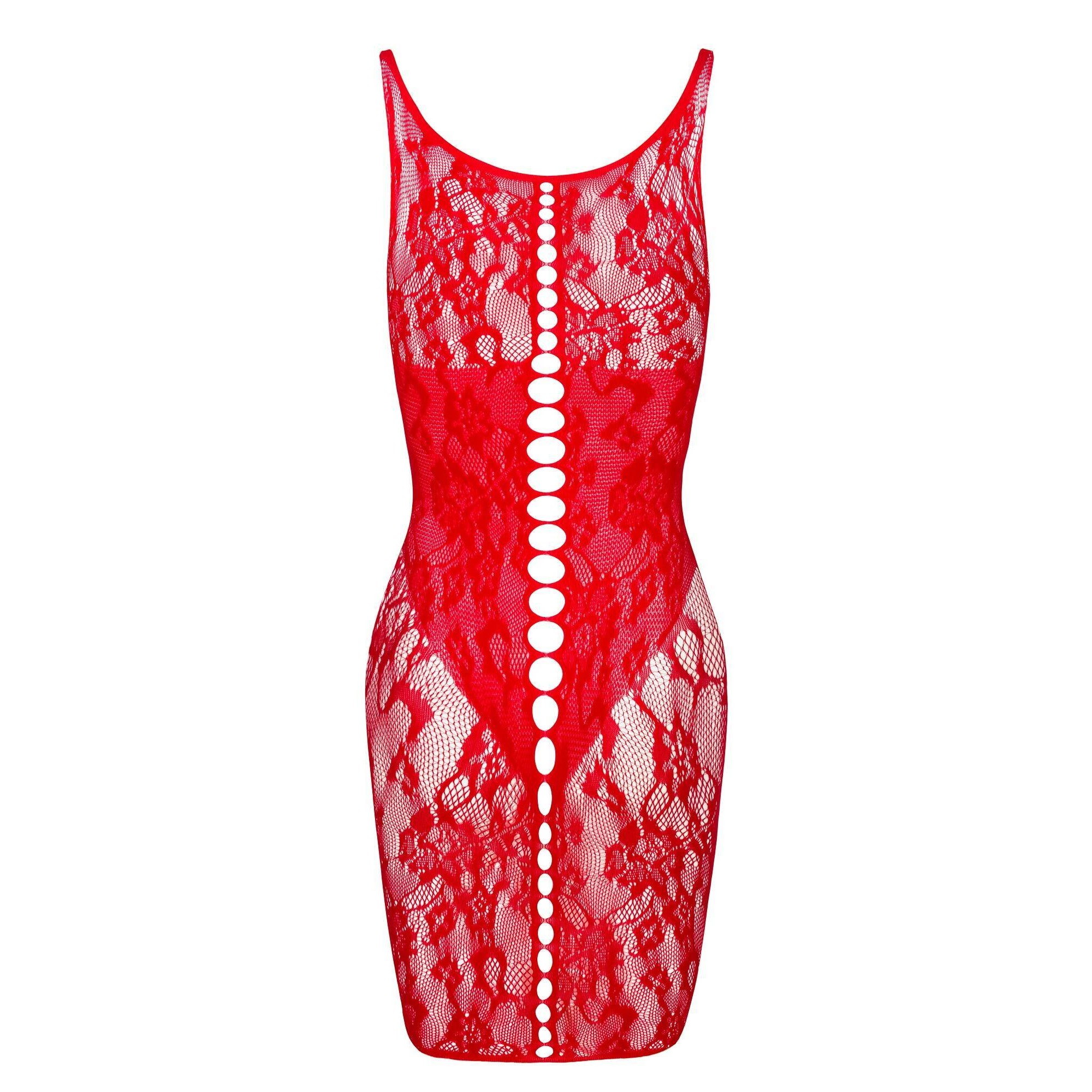 - Material elástico: El vestido está confeccionado en encaje elástico que se adhiere perfectamente al cuerpo, proporcionando comodidad.